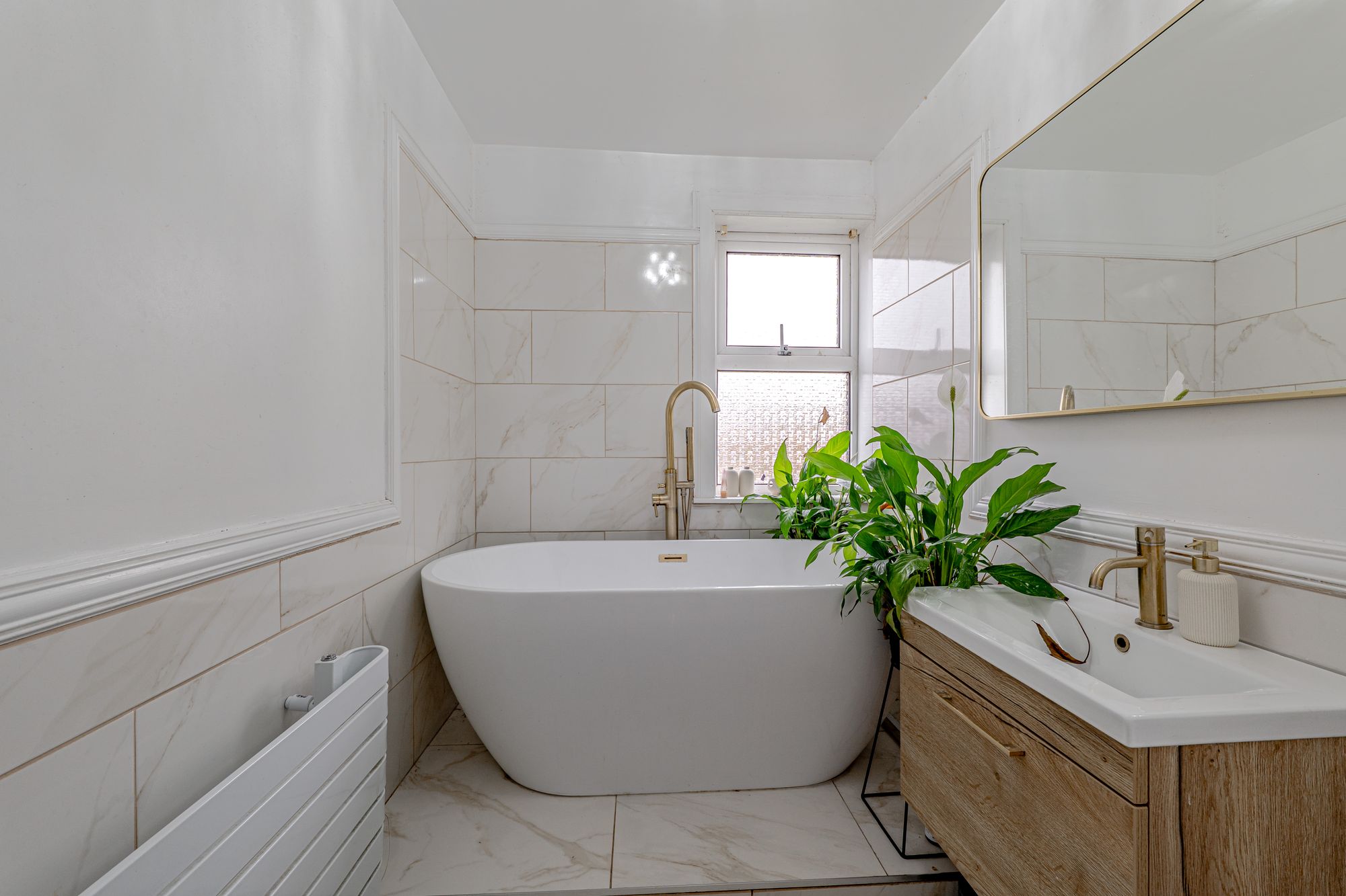 The third bedroom is well-proportioned and comfortably fits a double bed. The family bathroom has been upgraded beautifully with white and gold tiling, complimentary gold coloured fittings, wall mounted sink with cabinet underneath, WC and a freestanding large bath tub, making it the perfect atmosphere for relaxing.