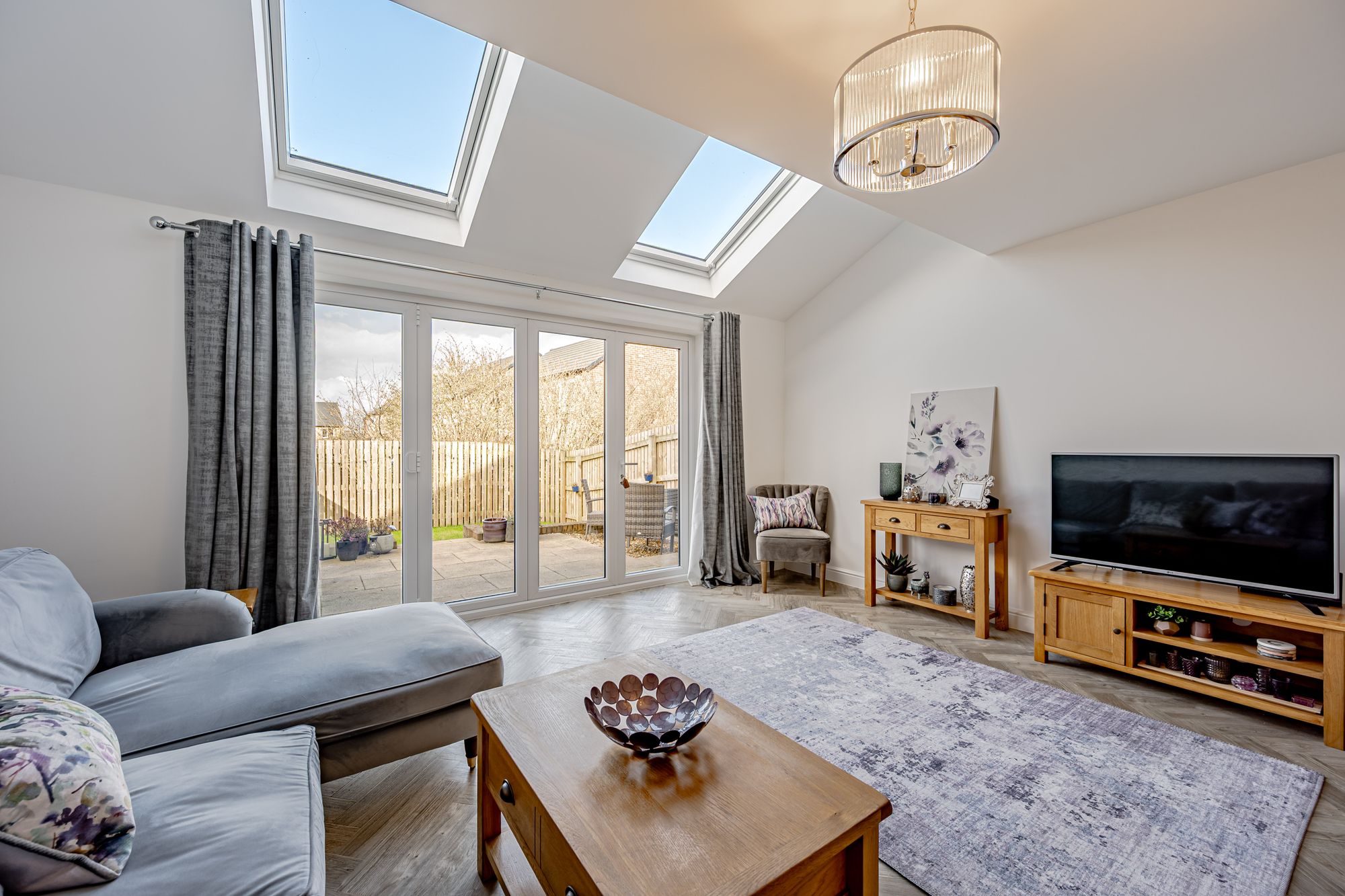 The lounge is to the rear of the property and benefits from ample natural light through the Velux windows and bi-fold doors to the terrace; bathed in soft, natural light streaming through expansive windows, the lounge offers an immediate sense of openness and airiness. The flooring complements the contemporary finish and open plan space which lends itself to another quality dining space, and there is still adequate space for sofas, sideboards and entertainment suites.