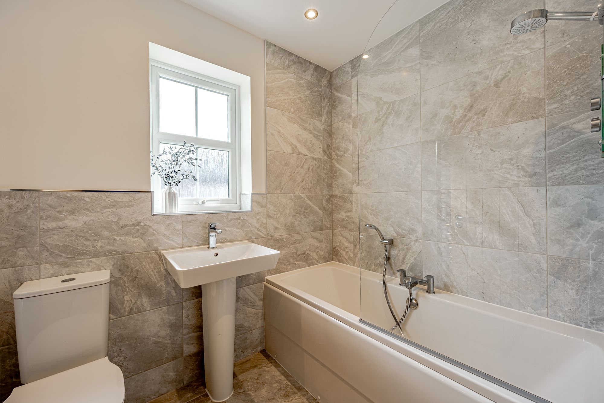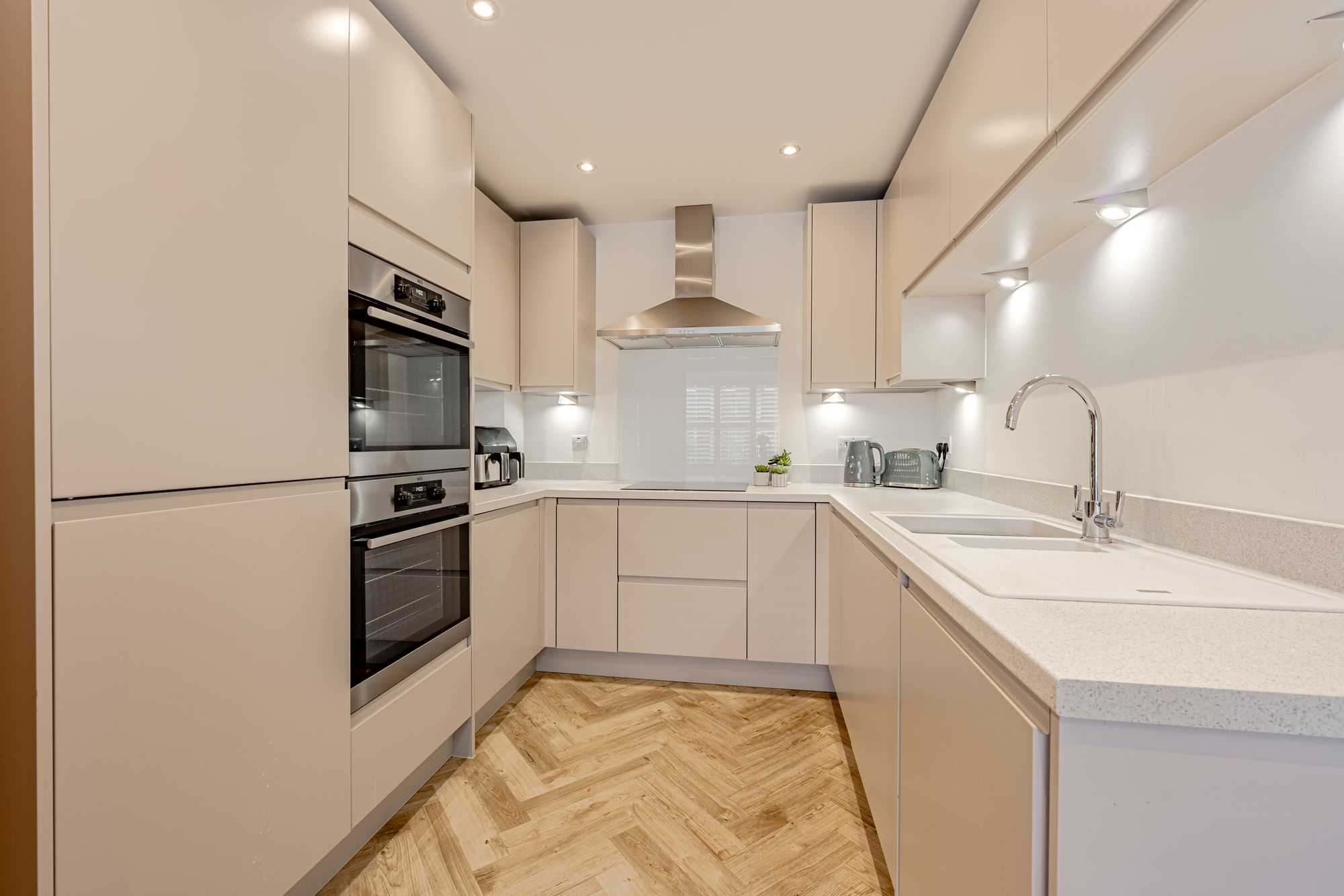 The front door welcomes a spacious and welcoming hallway fitted with herringbone LVT flooring which naturally flows through the entire ground floor. At the entrance there is a useful cloakroom on the ground floor with WC and hand wash basin as well as under the stairs storage. The kitchen has been upgraded from the standard specification, benefits from a breakfast nook adjacent to the bay window and includes modern, grey kitchen units fitted with Silestone worktops and integrated appliances to include AEG double electric oven, induction hob with extractor fan over, washer/dryer, and fridge freezer.