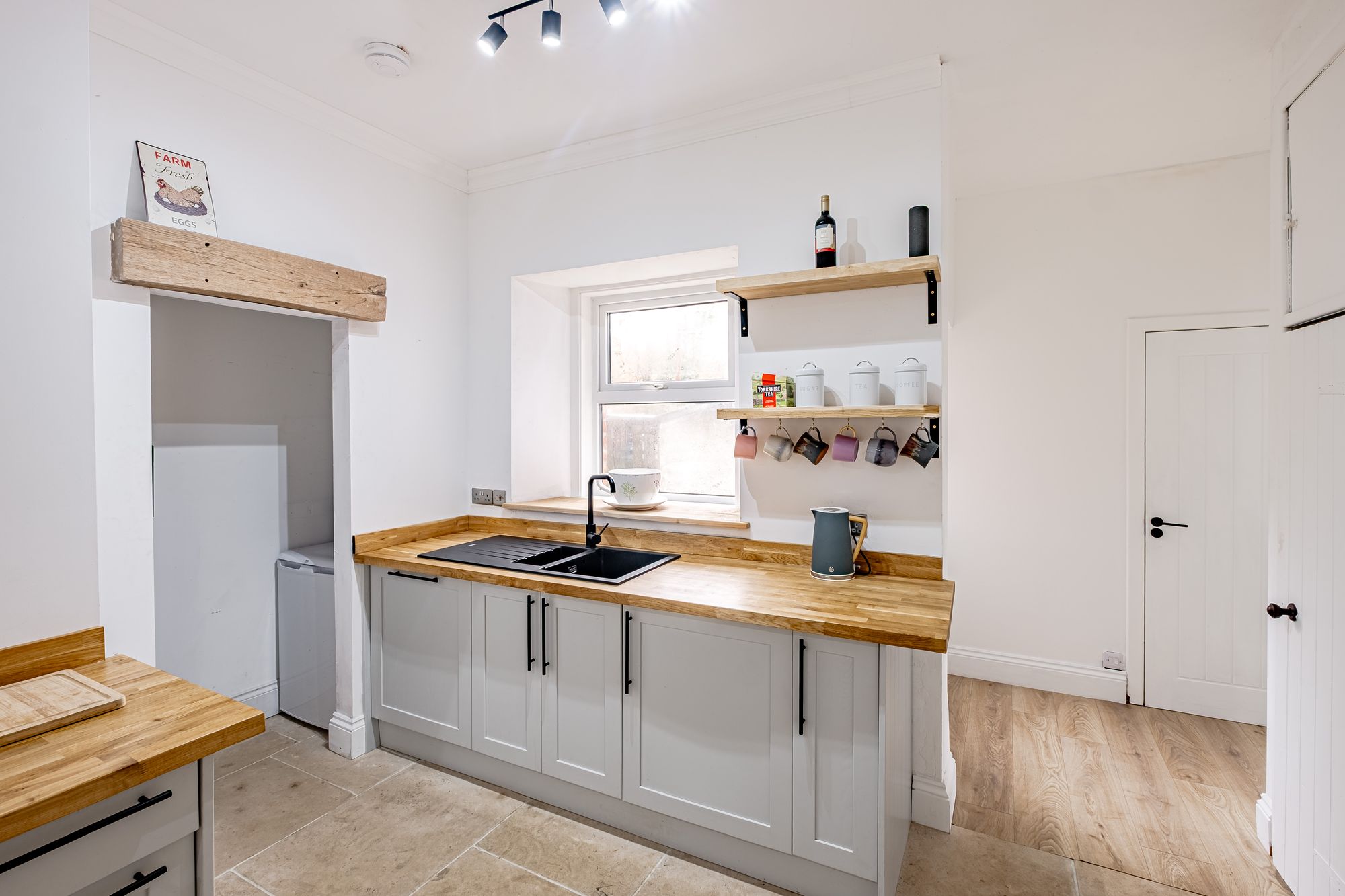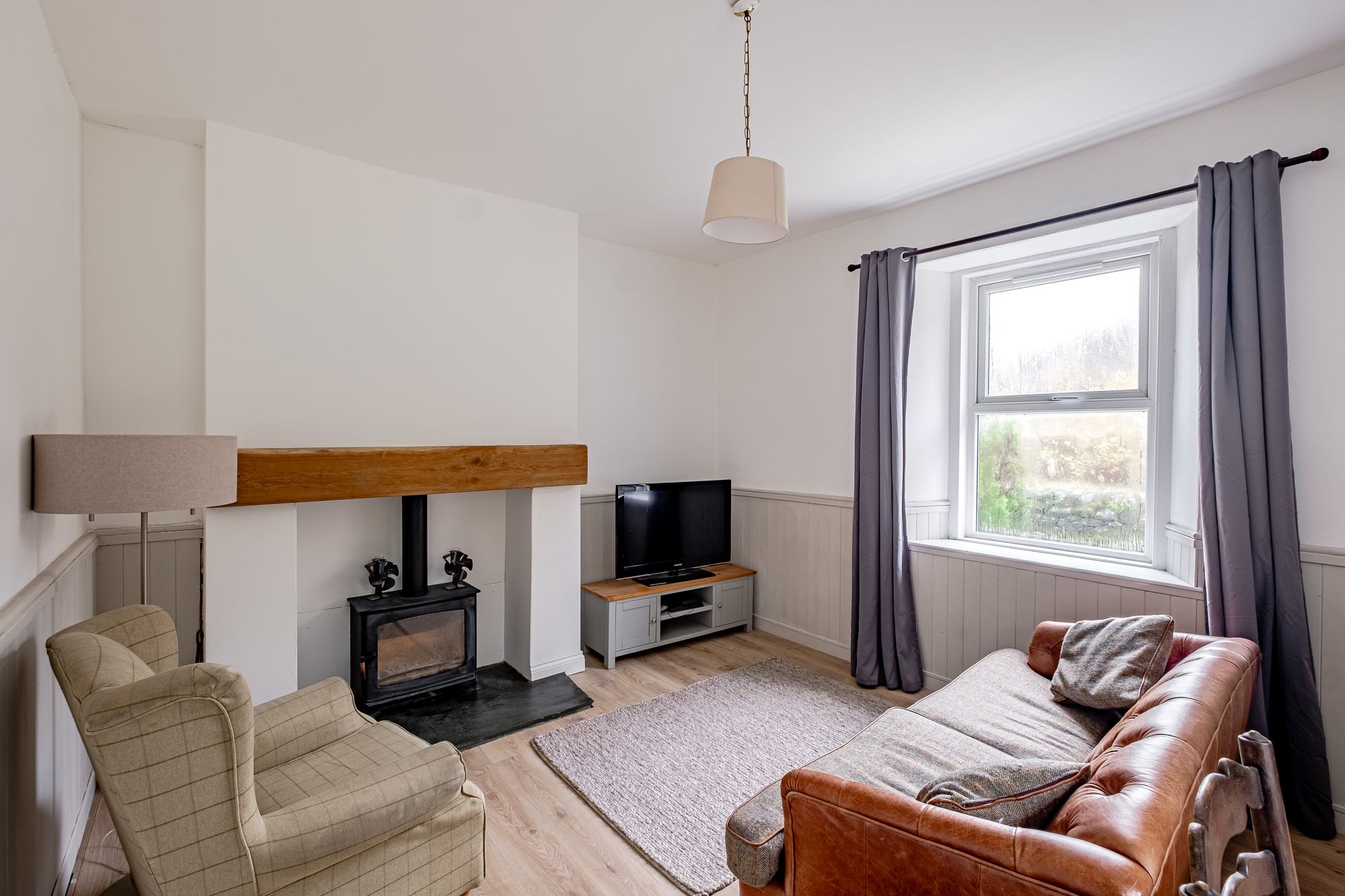 The main door leads into the bright and modern kitchen with oak worktops, forming a useful seating area/breakfast bar. There is an integral oven and grill, with a fitted hob with extractor fan over. There is a 1.5 drainer sink unit which is located close to a useful open cupboard. One of the bedrooms is situated off the kitchen and has the benefit of a built-in cupboard. There are two further bedrooms, one of which also has a useful built-in cupboard. The living room has dual aspect windows and a solid fuel stove set within a stylish bespoke fireplace. The bathroom includes a walk-in shower, wash basin in a vanity unit, a WC and a heated towel rail. The bathroom walls and floor are tiled. The remaining floor coverings are largely timbered, with the kitchen being French limestone and one of the bedrooms having a carpet.