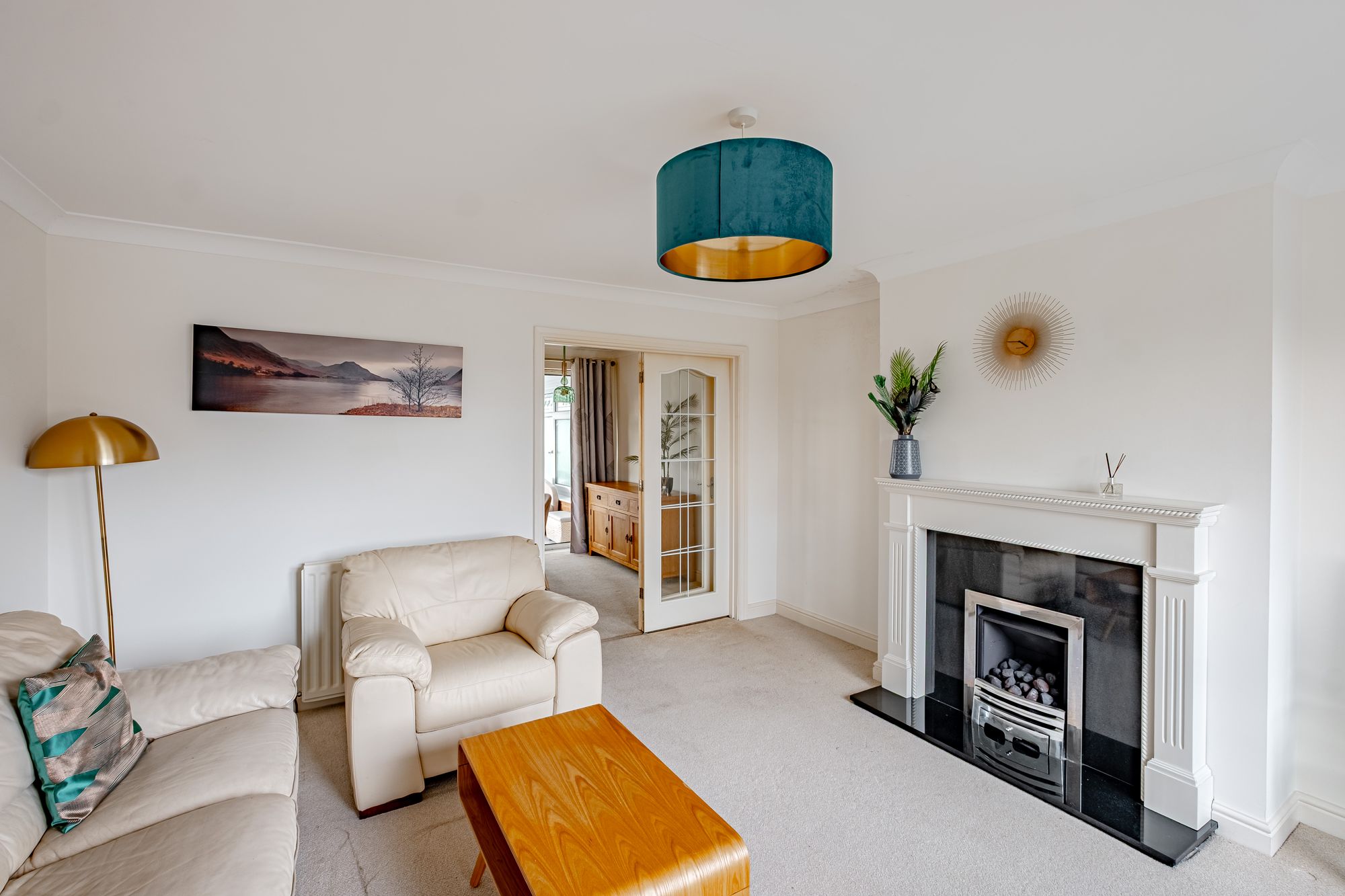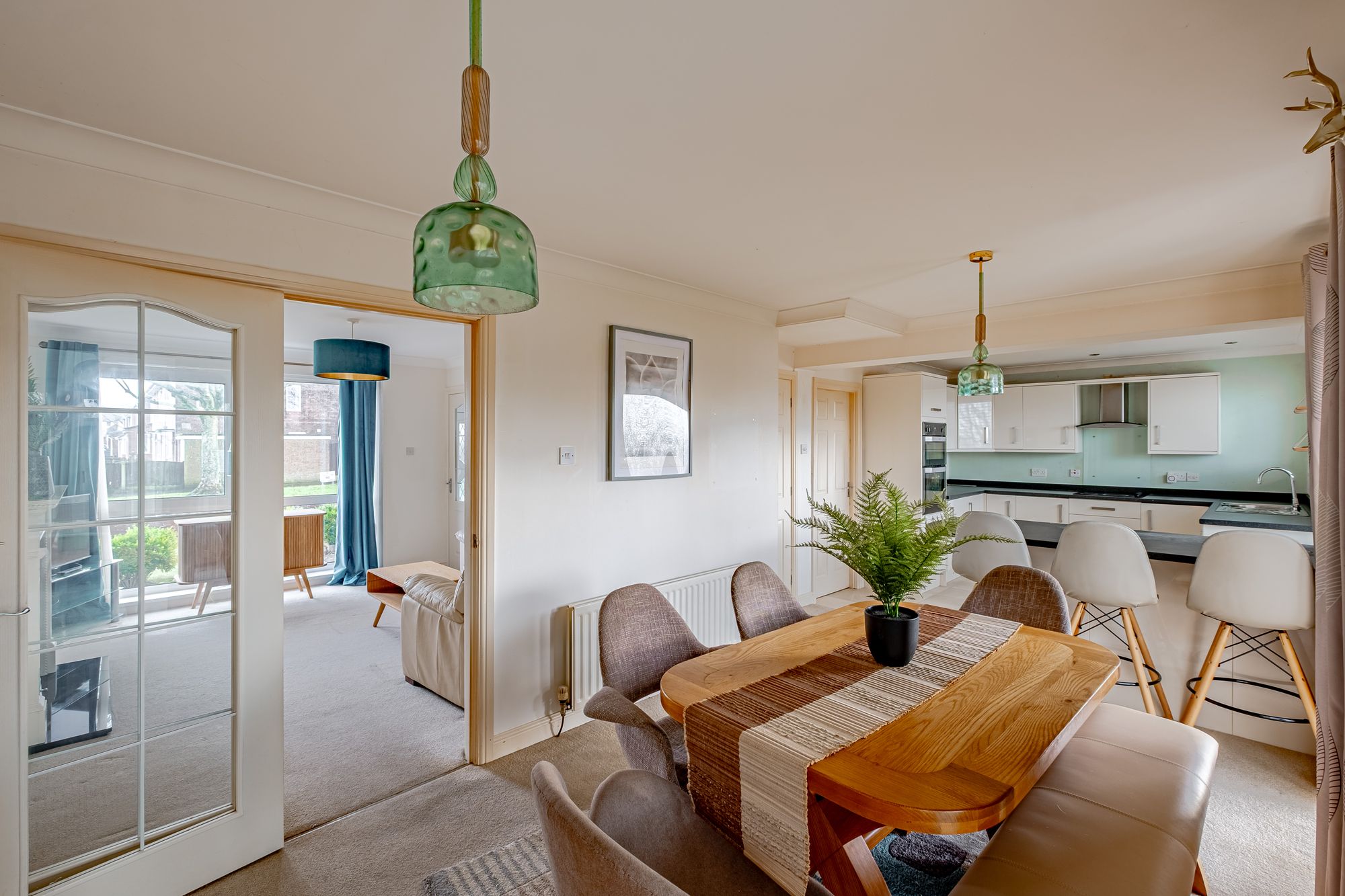 - Open-plan kitchen/diner with integrated appliances and breakfast bar