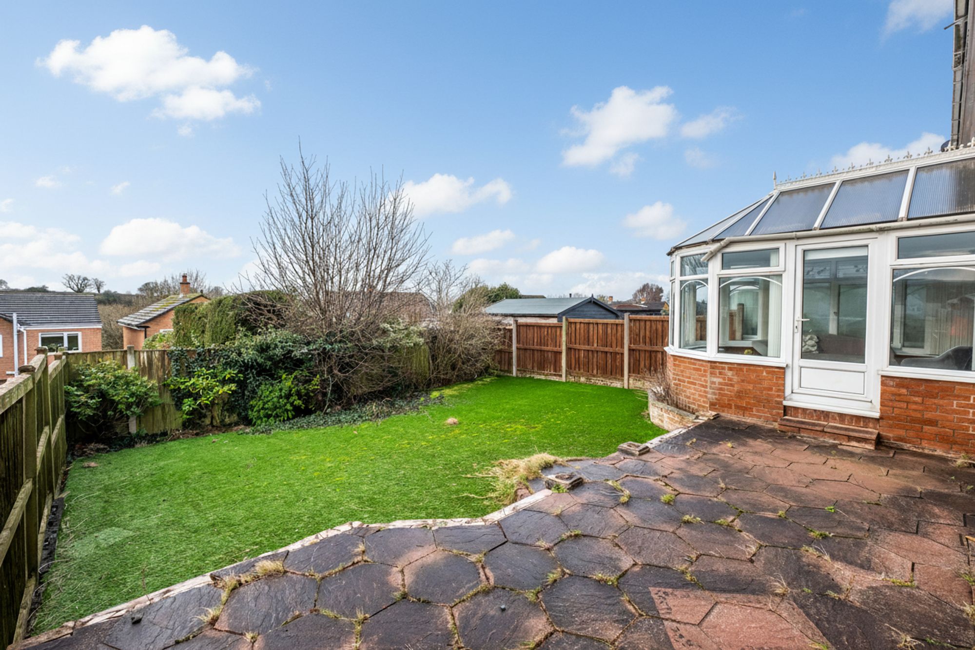 Externally, there is a brick paved driveway with small section of lawn laid with artificial grass and shrubbery. A side path and gate provides access to the rear garden where there is a sandstone patio and additional section of lawn also laid with artificial grass.