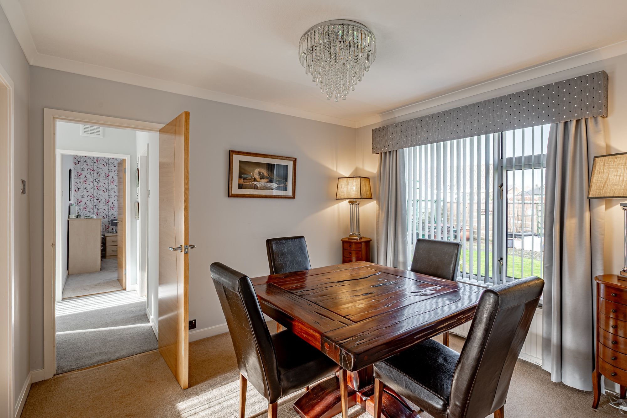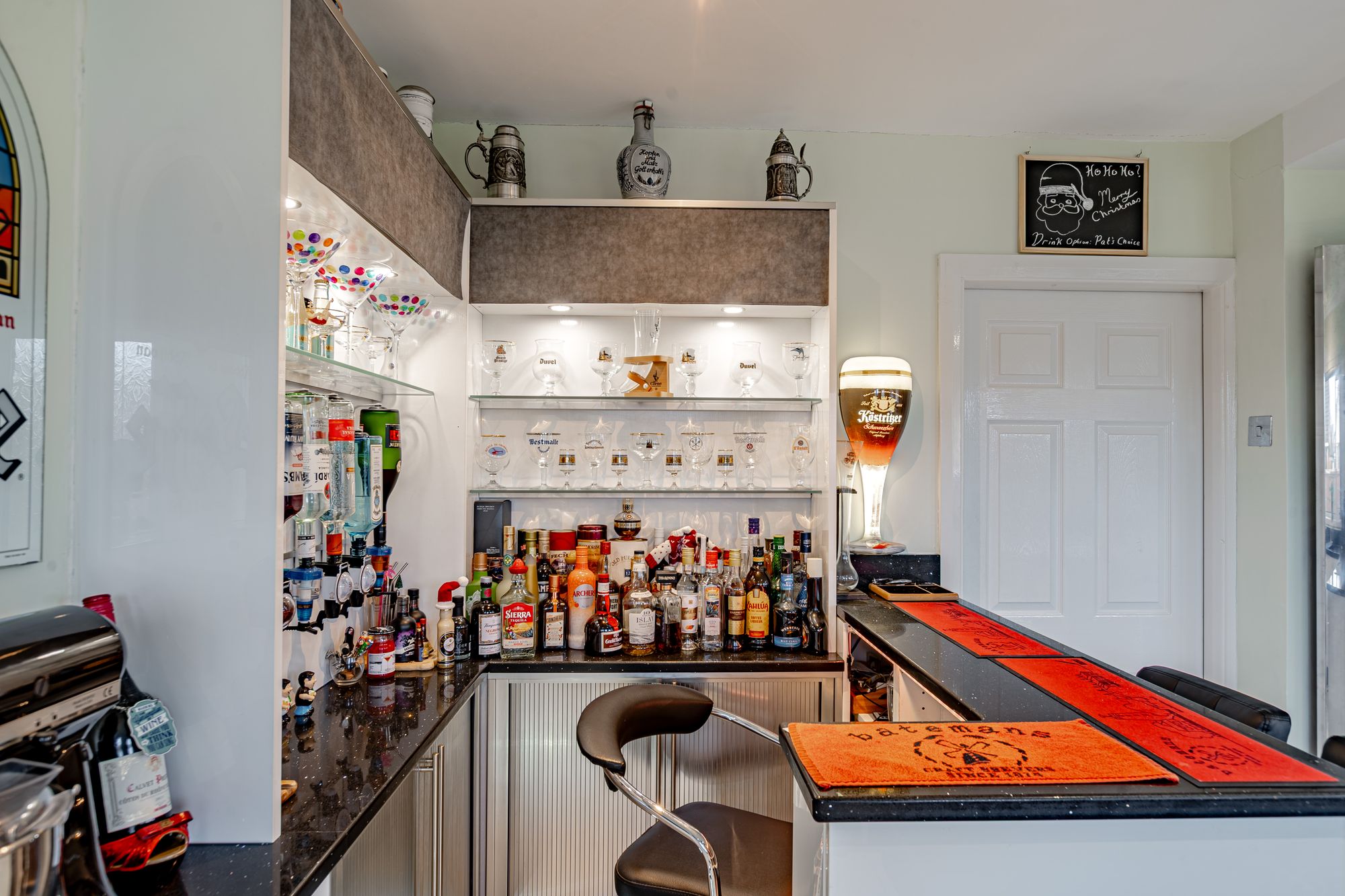 The front door welcomes a generous conservatory with seating area, enjoying pleasant views of the front lawn, complete with wood effect laminate flooring and complimentary skirting boards and window sill. An inner door welcomes a spacious entrance hallway with doors leading to the rest of the accommodation. The living room is the perfect size for entertaining, featuring a built-in bespoke gas fire and double oak doors which open into the dining room. Finished with oak glazed internal doors, the living room is bright and welcoming. The kitchen is a cook’s dream, featuring white floor and wall units with complimentary black granite worktops, integrated appliances including a double oven, microwave, dishwasher, Logik induction hob, fridge/freezer and large larder unit. There is also a fantastic bar with seating area (beverages not included in the sale). A back door provides access to the rear garden.