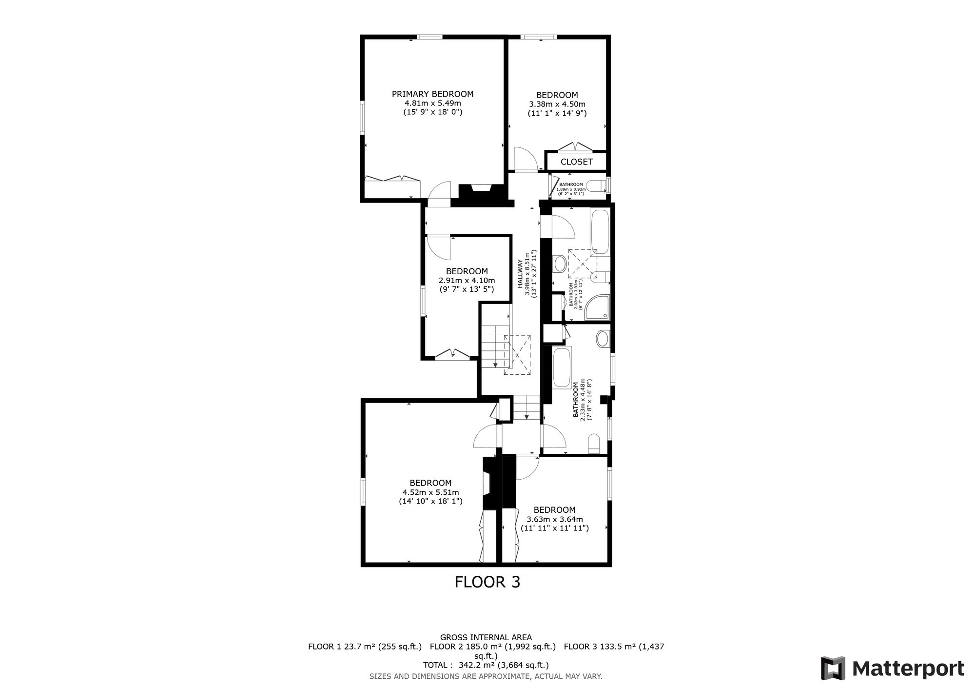 A staircase with carpet runner and Victorian wooden handrail and iron banister leads to a split landing and the first floor accommodation. On the right you’ll find two generous double bedrooms and family bathroom, with the front facing bedroom being the largest and featuring original wooden flooring. The family bathroom has tiled walls and is complete with bath with mains shower over, storage cupboard, wall mounted wash hand basin and WC. On the opposite side of the landing are three further bedrooms including a second large bedroom on the front which boasts dual aspect windows. All five bedrooms benefit from fitted wardrobes. The second family bathroom is also tiled and is complete with bath, separate shower cubicle (we understand this may not work), wash hand basin and WC. There is a separate WC adjacent to the bathroom.