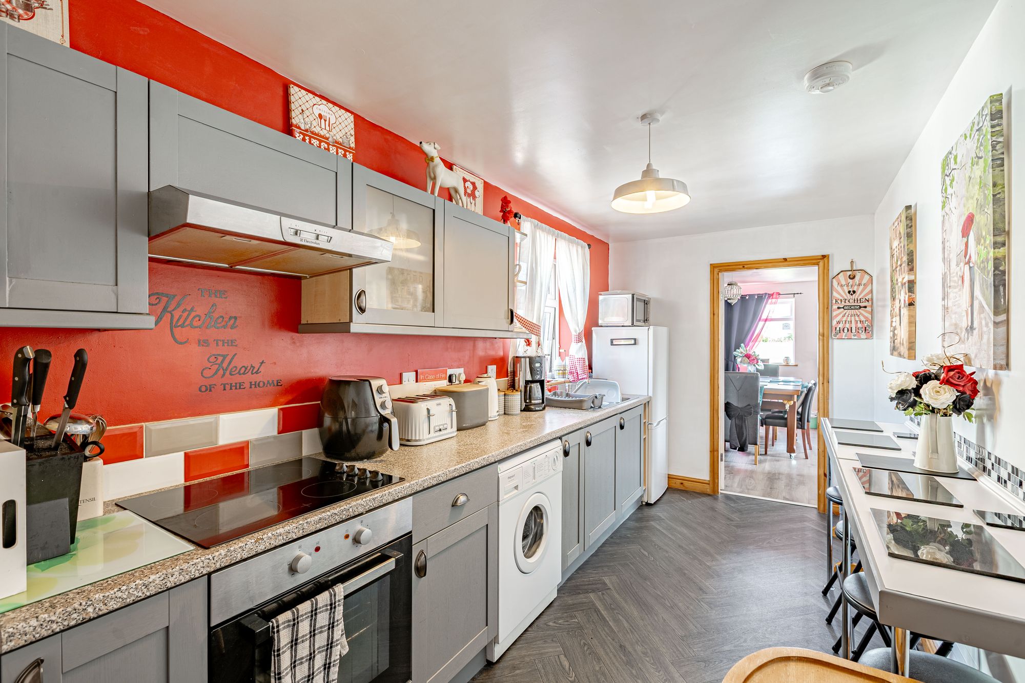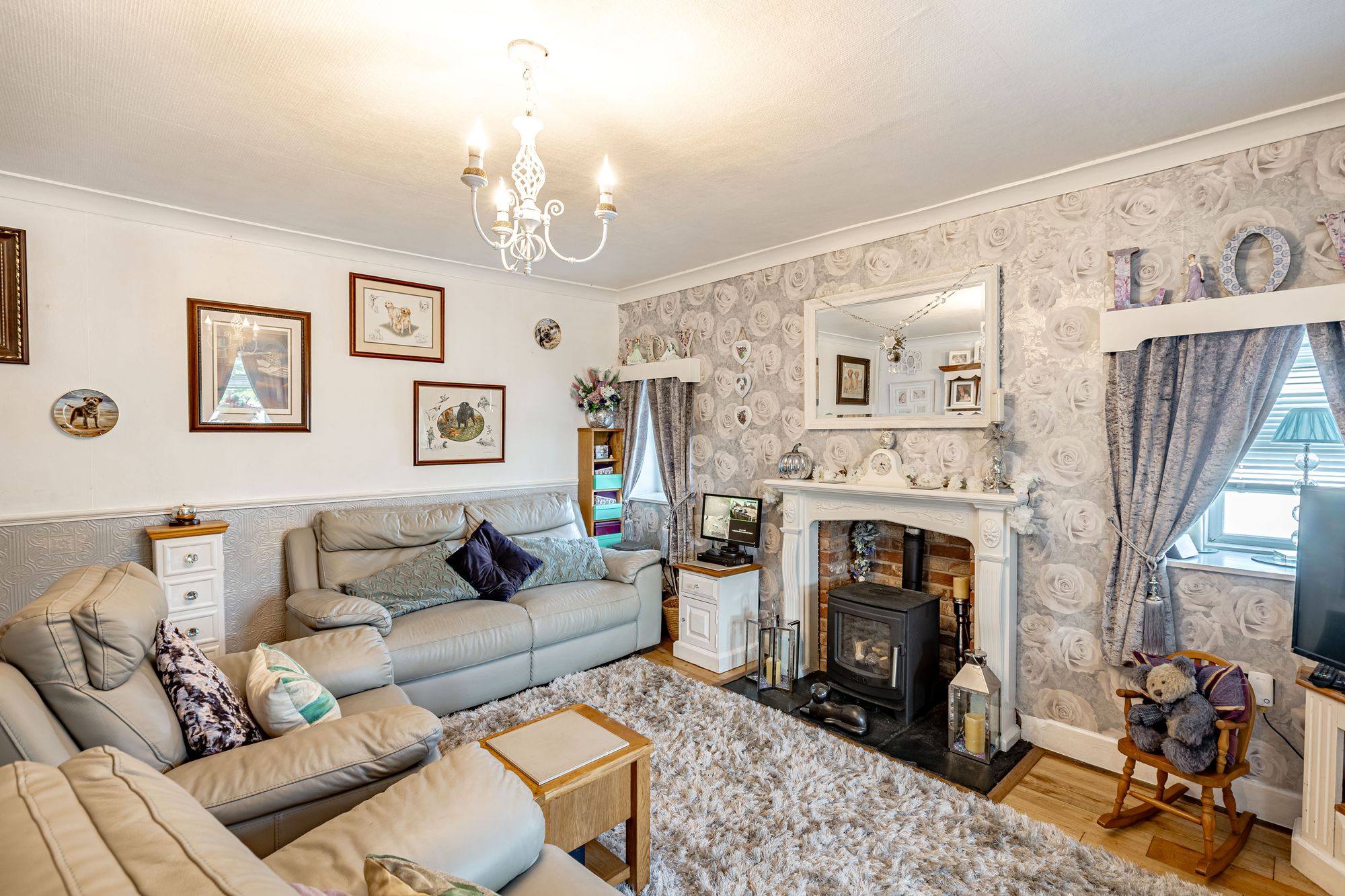 The property is accessed from the front via a short length of shared drive, into a large lawn and parking area with the static caravan to the right included in the sale. The front door opens into a porch area with room for coat hangers before entering the dining kitchen with stone flagged floor, timber wall and floor units, Belfast sink with mixer tap, integrated dishwasher and a solid fuel stove incorporated into the old range, with beautifully tiled doors. The Belling range cooker has a LPG powered hob and three ovens. A clothes airer is suspended from the ceiling.