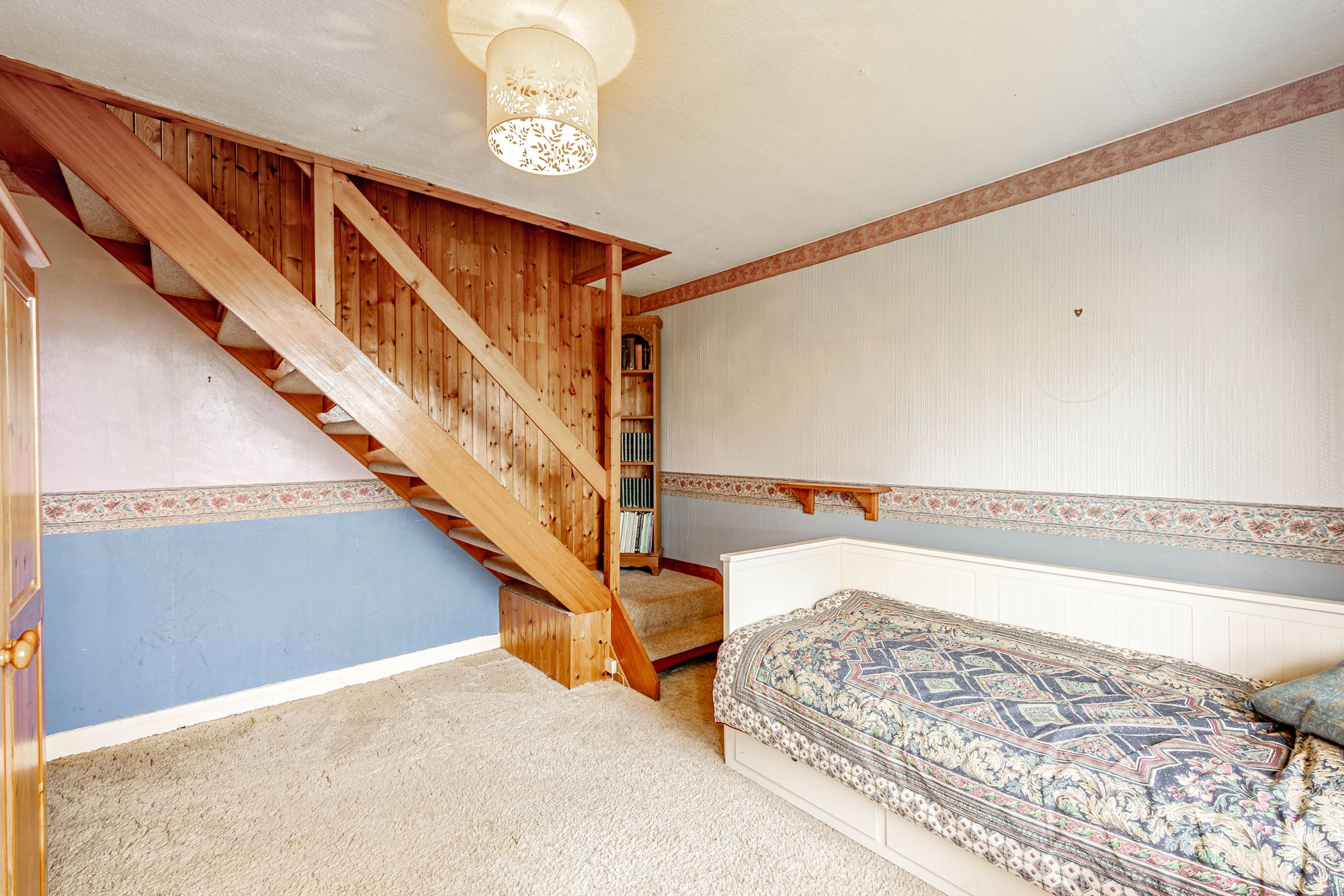 The shower room has part timbered walls and comprises of an electric shower, WC and wash basin. There is an airing cupboard with shelves and the hot water cylinder. One of the bedrooms is to the front of the property and has good views. The double bedroom to the rear has fitted wardrobes and views of the back garden. The remaining front room is a former bedroom with stairs to the loft conversion which adds a double bedroom with exceptional views from the dormer window.