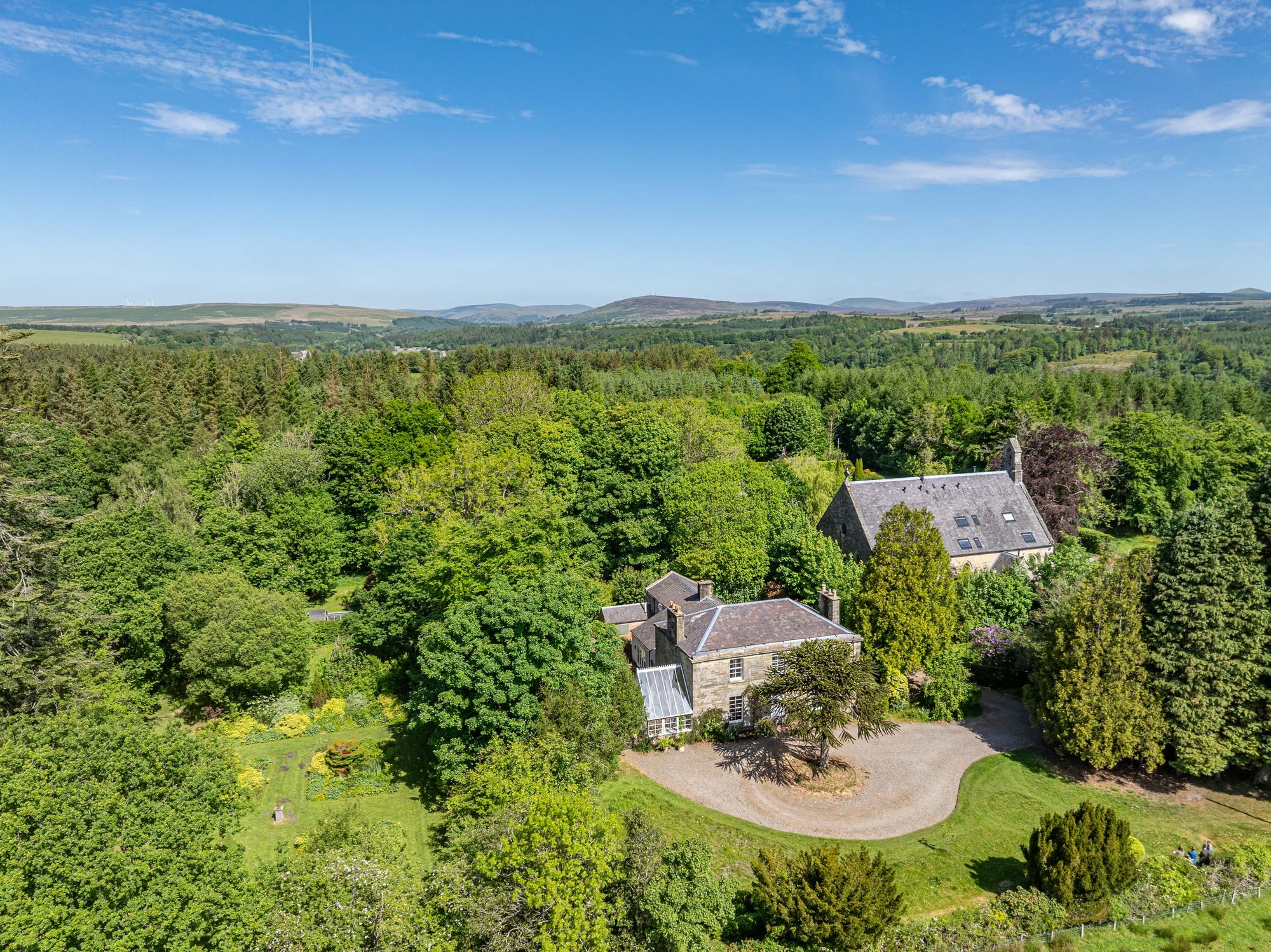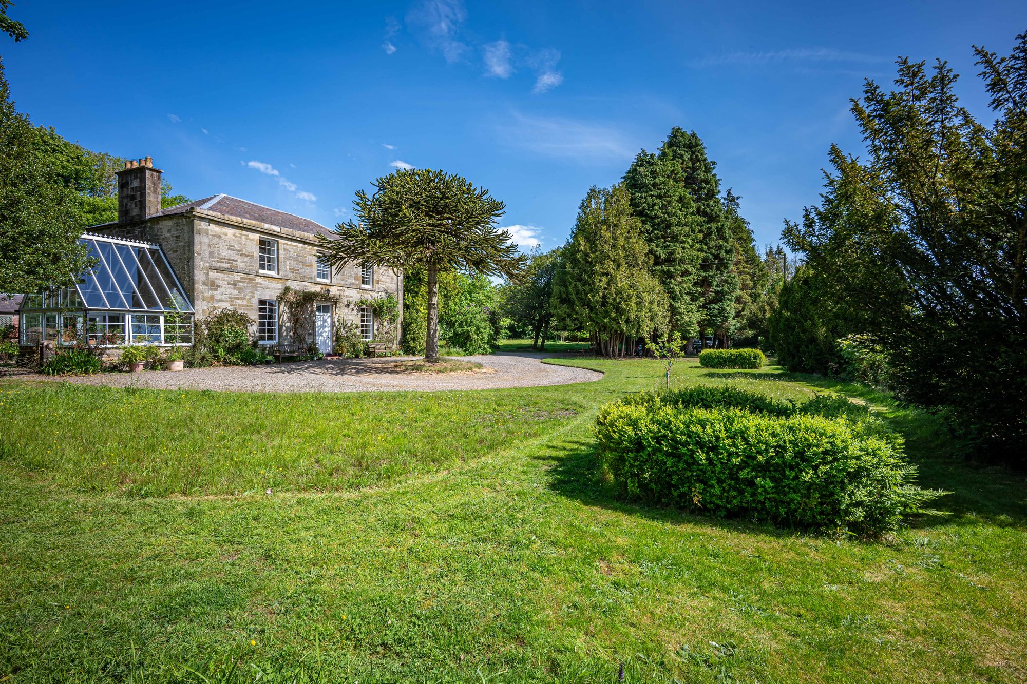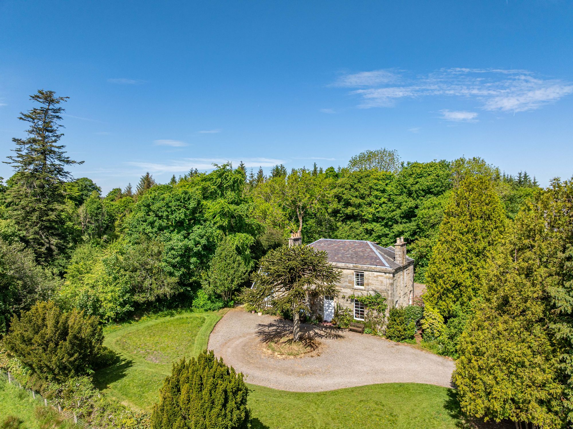 - Gated entrance with wooded driveway and circular turning point at entrance of house