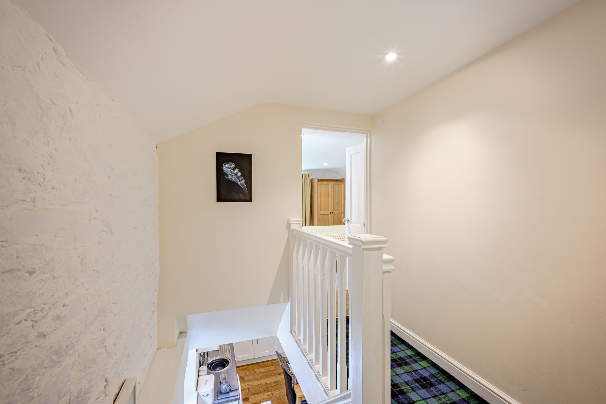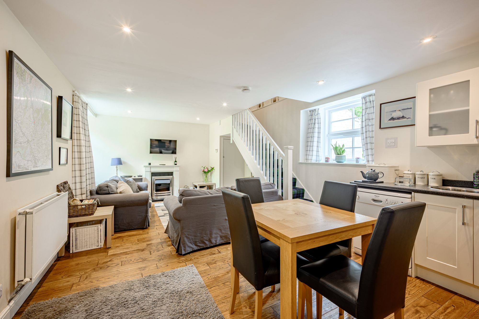 The Coach House is a two storey, two bedroom annex situated at the rear of the main house with its own private access. Currently the Coach House is being run as a successful self-catering holiday let business with about 77% occupancy per annum and a turnover over of roughly £23,500. The ground floor is open plan, with a fully fitted kitchen featuring complementary work surfaces and upstands complete with integrated electric oven hob with extractor over, separate double oven and plumbing for a dishwasher and washing machine. The living area features an electric fire set in a feature surround, enjoys pleasant views of the garden and both areas are laid with oak flooring.