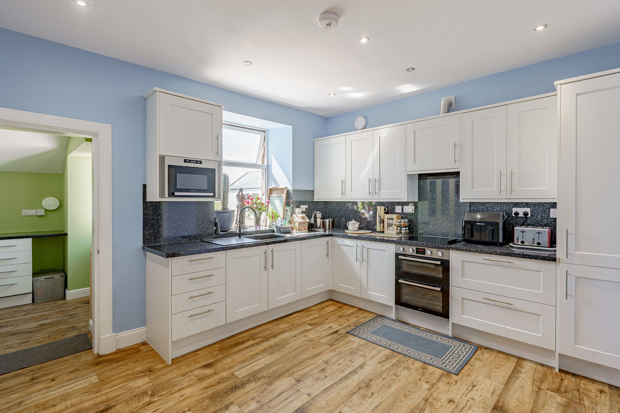 The rear door opens into the utility room, with fitted units and sink. A shower room is located at the end of the utility room and comprises of a shower cubicle with wc and wash basin both contained in a vanity unit offering useful storage. The kitchen is modern with matching worktops. It has integral electric double oven, hob and fridge, as well as space for a microwave. The kitchen flows into the open plan living room with solid fuel stove and a door to the conservatory at the front of the house, which is currently used as a dining room. All of the preceding rooms have timber floors. From the kitchen, the ground floor covering turns to carpet and there are two double bedrooms, which complete the ground floor accommodation.