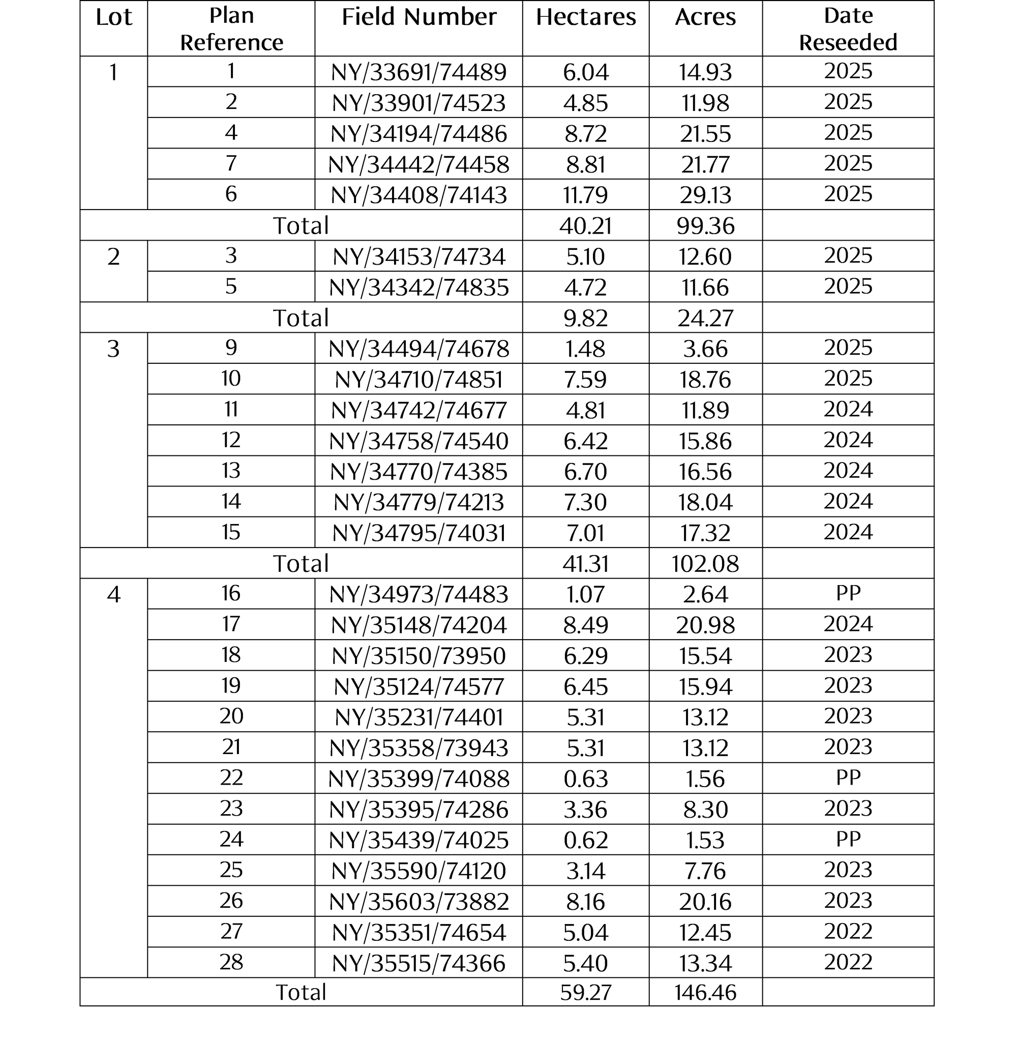Fields 16, 22 and 24 are laid to permanent pasture. All other fields have been re-seeded with a high-yielding Dundas clover mix in the last four years. Lime will be applied in April 2026.