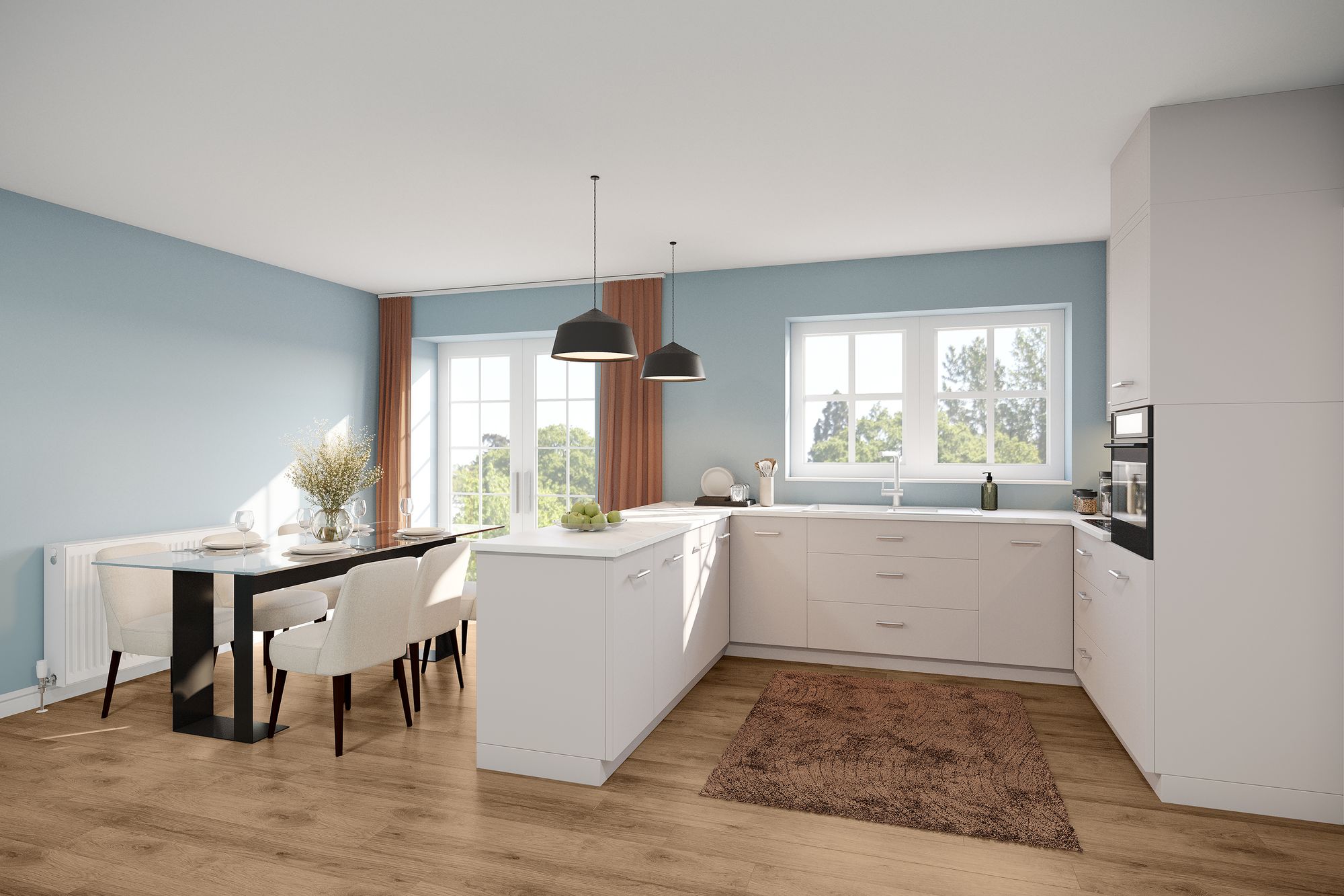 Continuing through, the hallway connects to a bright and spacious open-plan kitchen/diner. The kitchen is fitted with modern kitchen cabinets, finished with a white quartz stone worktop and integrated appliances. Patio doors connect seamlessly to the private rear garden, bringing the outdoors in and creating an ideal space for gatherings in all seasons.