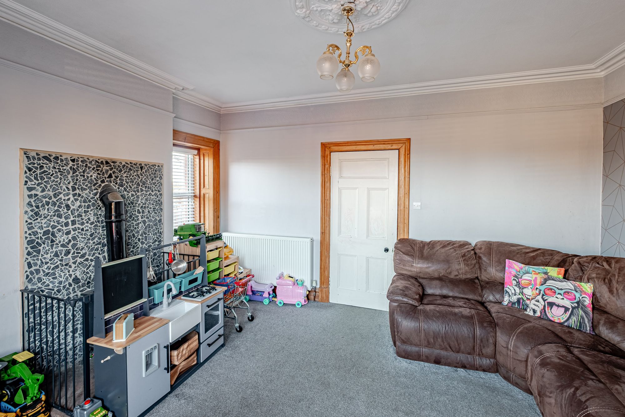 The front door welcomes a spacious entrance vestibule with Victorian tiled floor and wooden, glass paned inner door leading into the main hallway. The living room is situated at the front of the house, featuring a magnificent bay window, stunning cornice stone and woodburning stove set on a stone hearth. The kitchen/dining/living room is the perfect space for entertaining. There is ample space for a large family dining table in the kitchen area and a separate section for relaxing opposite an additional multi-fuel stove set in a sandstone fireplace.