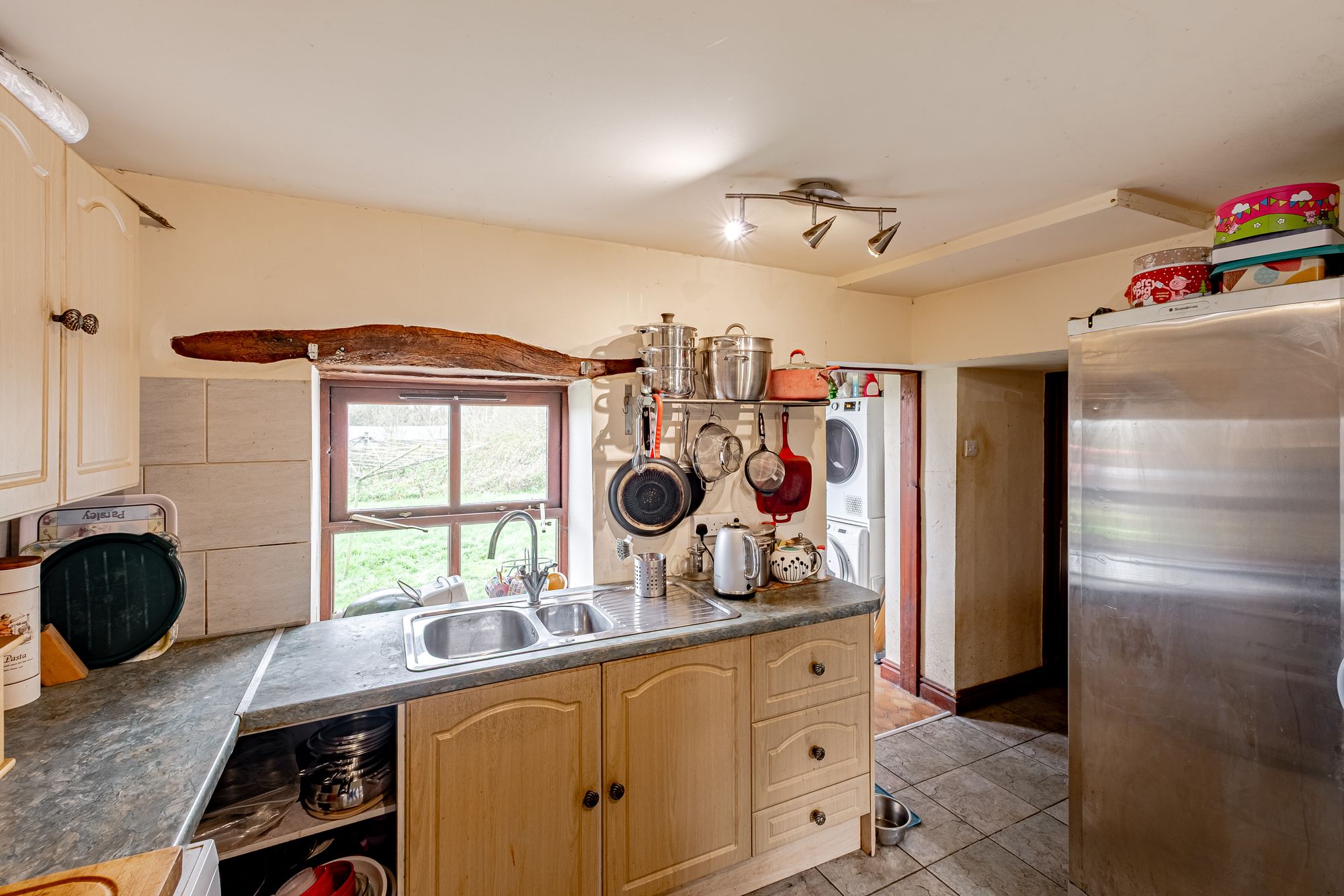 A deceptively large barn conversion, which would benefit from some upgrading. The property has a living room, a fitted kitchen, dining room, utility room, three bedrooms, a study, two bathrooms and a separate WC. There is a small garden to the front, while to the rear of the house is a large garden, with open views. The access is shared and there is ample parking for several vehicles. It has timber framed double glazed windows and is a home with a lot of character.