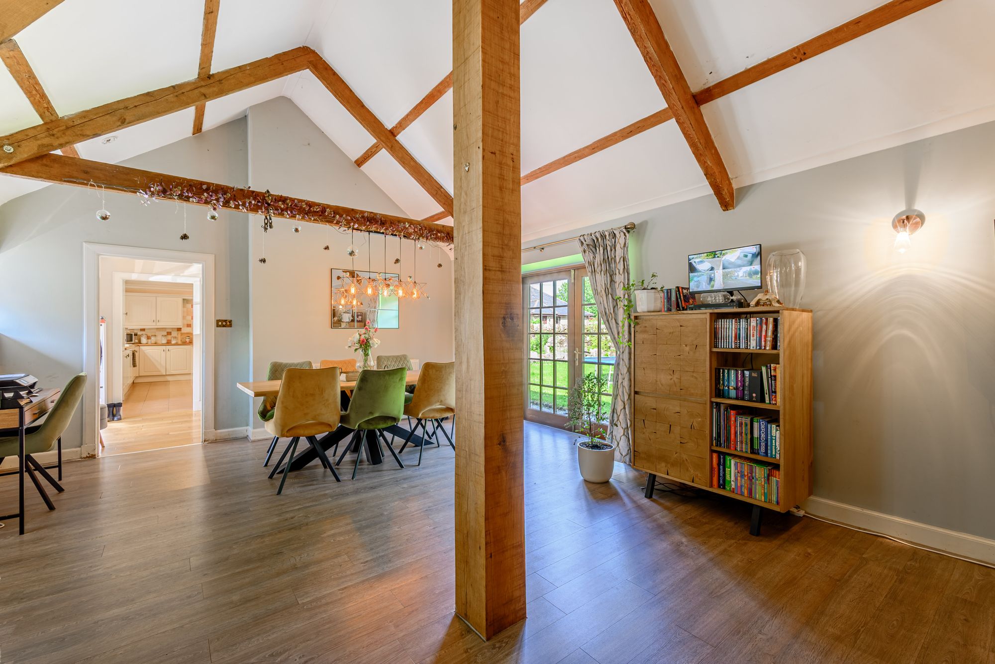 The property is finished to a high standard internally, offering a generous kitchen/dining room with exposed beams, shaker style units, central island, integrated appliances and double doors that open to its private garden.