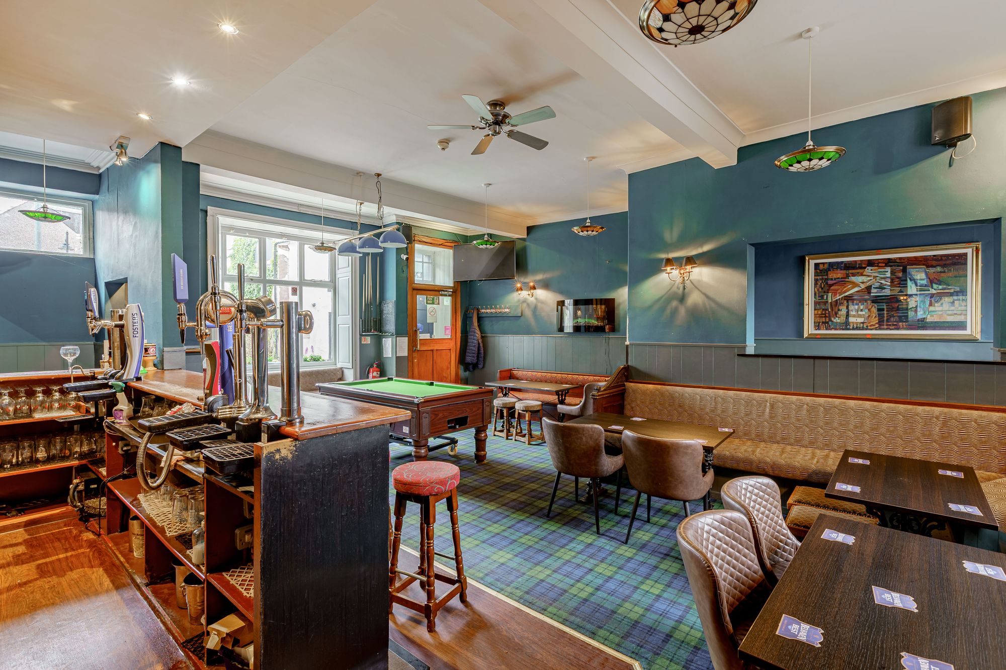 Entry to the hotel is from the high street, a prominent position on the A7 which means it can’t be missed by passing trade. The front door opens to a ground floor lobby with stairs leading to the reception on the first floor and onwards to the letting rooms. This entrance is primarily used for hotel guests and customers who would like to eat in the restaurant located at the rear of the building. There is a separate door on the high street for accessing the public bar which is very popular with locals and often the bar is filled to the brim when there is live music playing on a Saturday night. The main bar is nicely decorated, with wall fitted benches and tables and stools. There are two wall mounted tvs, a pool table and behind the bar, a selection of 8 draught beers and gin/whisky shelves. The Douglas Hotel is also a venue for the Sunday Pool League and Langholm Legion Football Team, whom they sponsor.