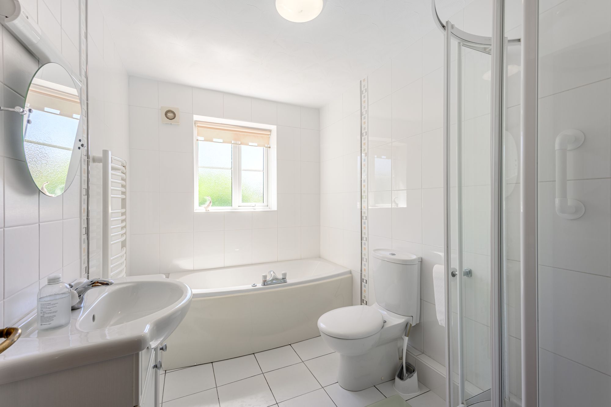 There are three double bedrooms in the property, with the primary bedroom featuring fitted wardrobes and an ensuite WC with hand wash basin. The WC was once a small ensuite shower room and there is scope to convert this back if desired. The family bathroom is spacious and bright, complete with fully tiled flooring and walls, a bath, corner shower cubicle with mains fed shower, towel rail and hand wash basin with mirror above.