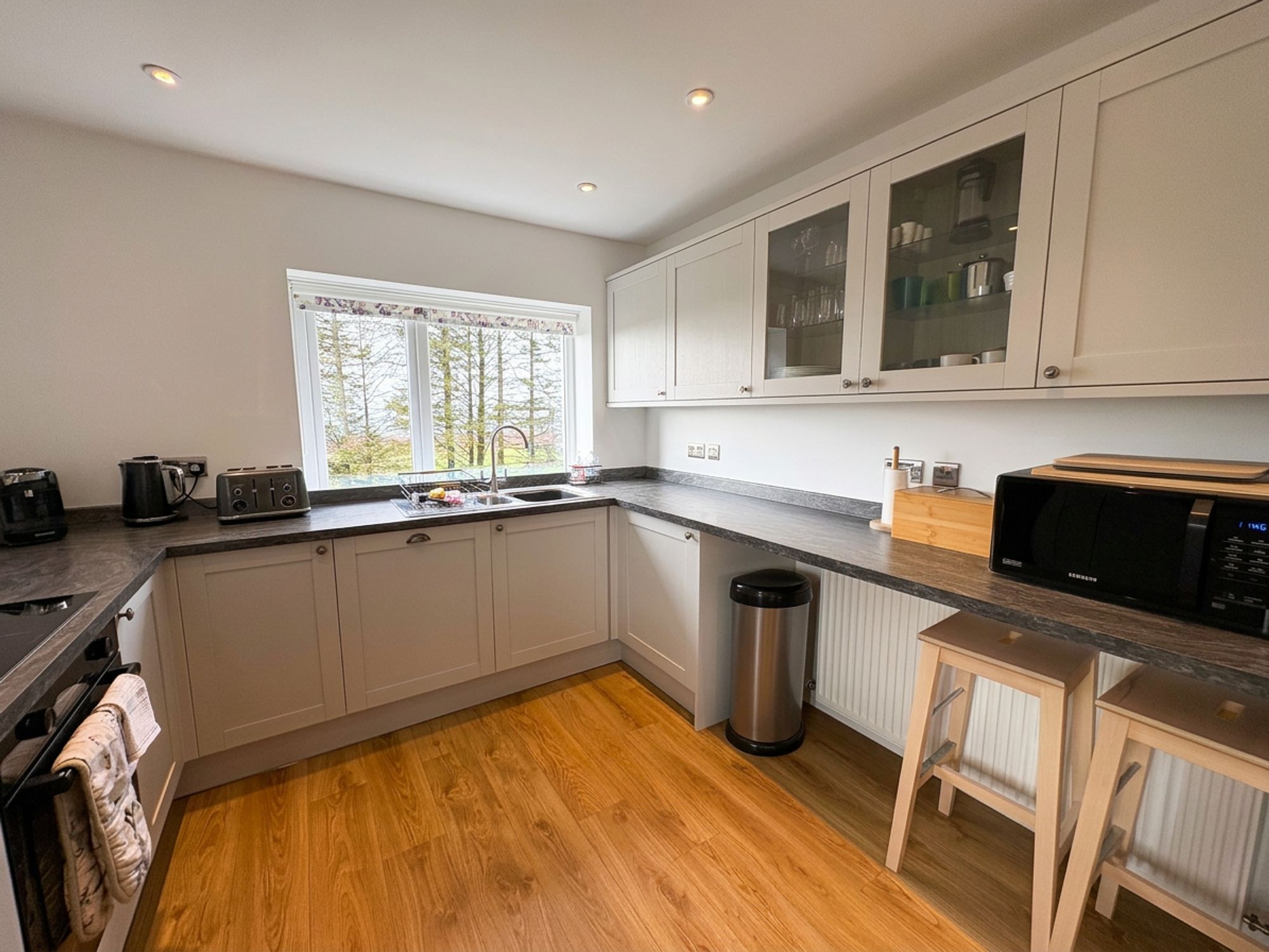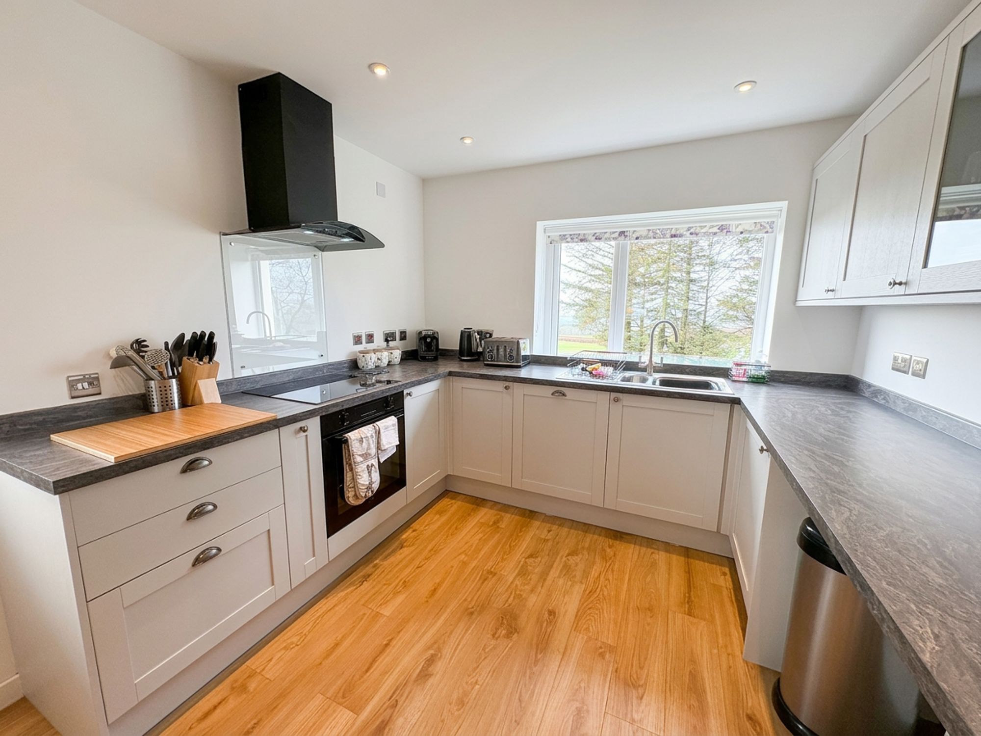 The kitchen is located towards the rear of the property and benefits from ample cupboard space and work surfaces; the kitchen is presented in a modern, but in keeping style for the property, and provides a breakfast bar area for casual dining. There are stunning views over the valley from the kitchen’s window, with the property’s elevated position above the garden area below.